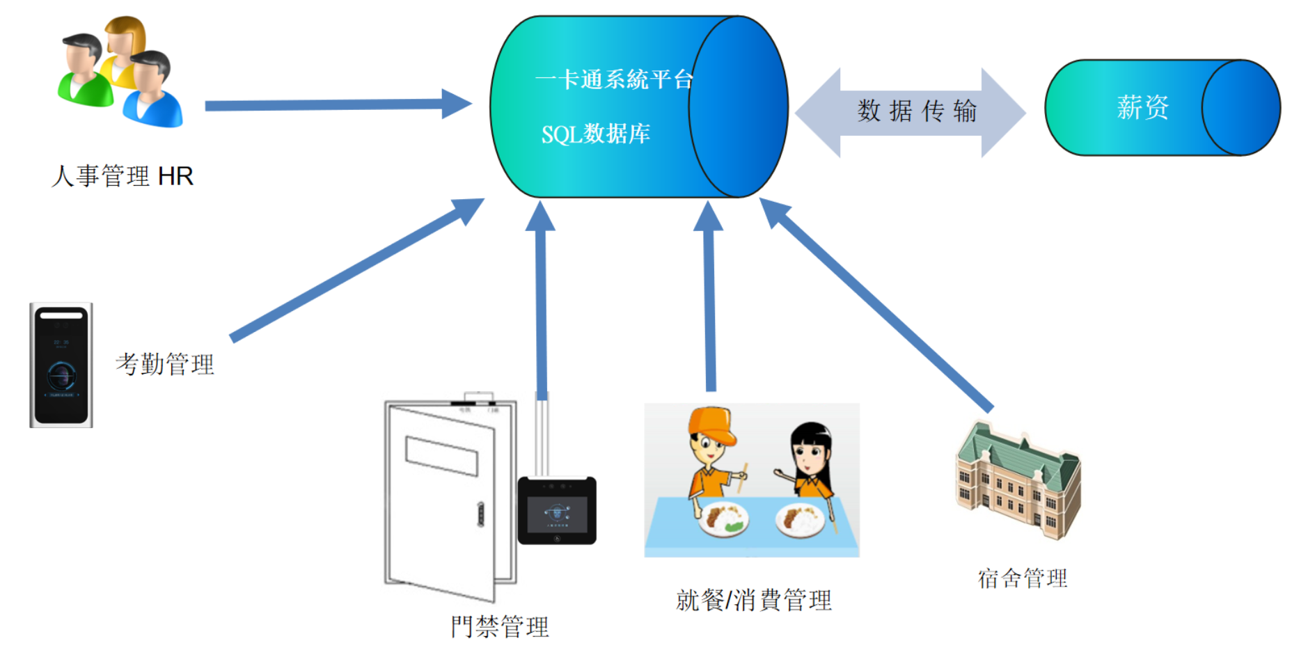 一卡通系统平台,采用C/S架构设计,平台主要由人事管理模块、考勤管理模块、门禁管理模块、消费管理模块、宿舍管理模块等功能模块组成。多账号权限管控功能,根据不同人事管理员设定相关的管理权限。